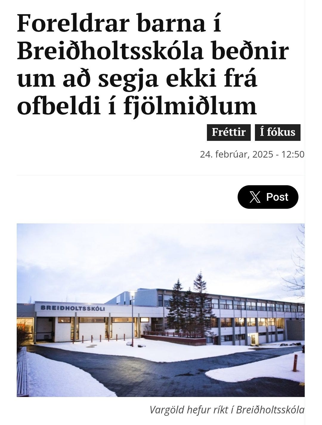 Foreldrar barna í Breiðholtsskóla beðnir um að segja ekki frá ofbeldi í fjölmiðlum,“ Nútíminn, 24. febrúar 2025.