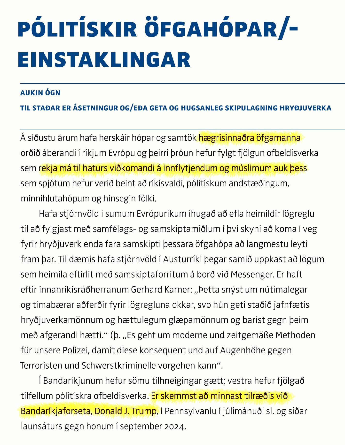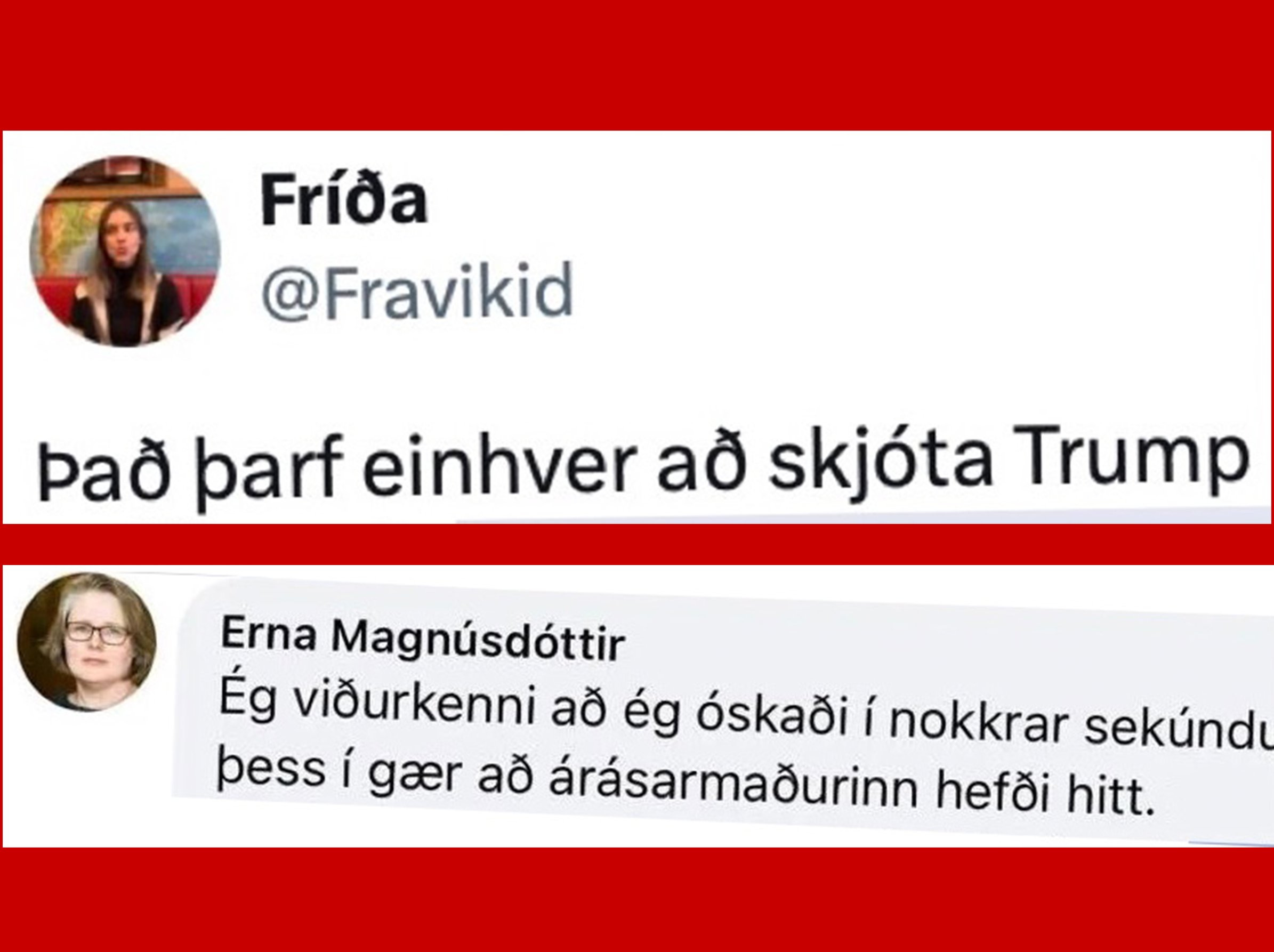Ógnin við Trump einskorðast þó ekki bara við erlenda tilræðismenn heldur hafa íslenskir vinstrimenn einnig kallað opinberlega eftir því að Trump verði drepinn. Samt þykist greiningardeild ríkislögreglustjóra búa yfir vitneskju um að það séu hægriöfgamenn sem séu ógn við lýðræðið á Íslandi ...