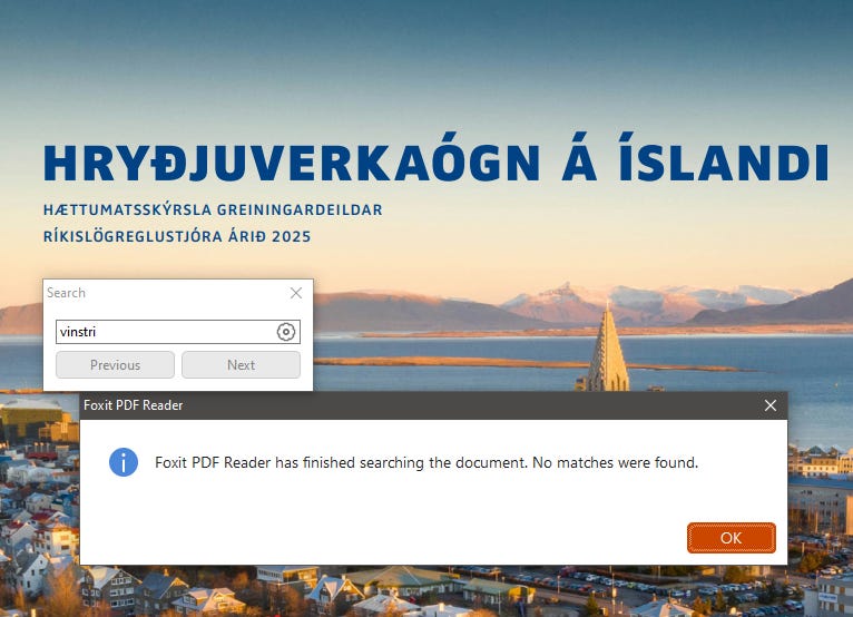 Í nýrri skýrslu greiningardeildar ríkislögreglustjóra um hryðjuverkaógn á Íslandi segir að helsta hættan komi frá „ofbeldisfullri hægri öfgahyggju“.2 Athygli vekur að orðið „vinstri“ kemur hvergi fram. Hverjir eru raunverulega að hóta ofbeldi hér á landi?