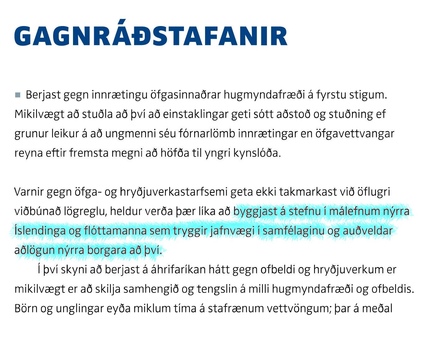 Greiningardeild ríkislögreglustjóra kallar líka eftir því að fjölmenning verði aukin á Íslandi og leggur til að vinna með félagasamtökum á borð Samtökin ‘78 til að liðka fyrir innflutningi fólks frá þriðja heiminum. Þetta þýðir hrörnun gilda, minni samheldni, enn minna traust—en traust og sterk gildi eru máttarstólpar millistéttar á Íslandi.8